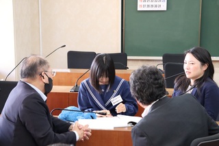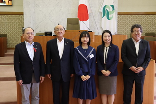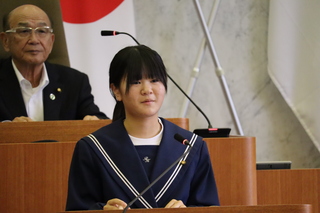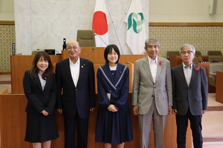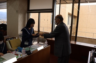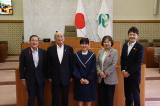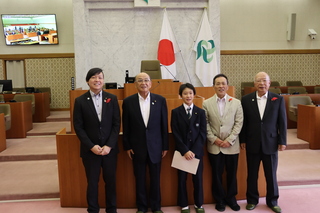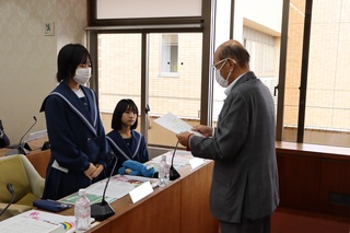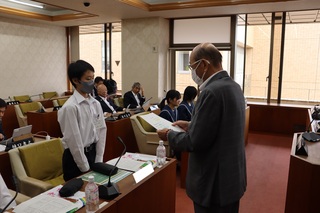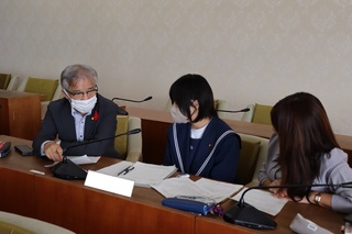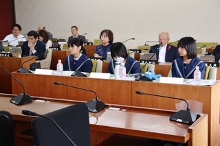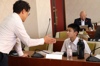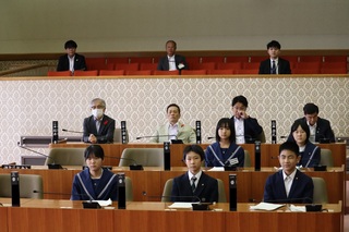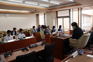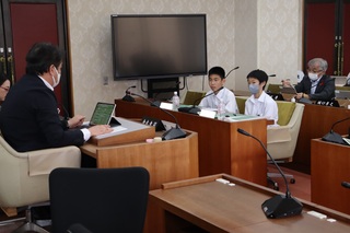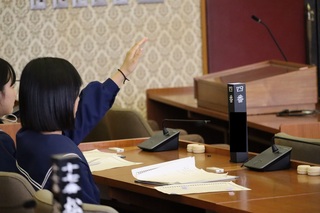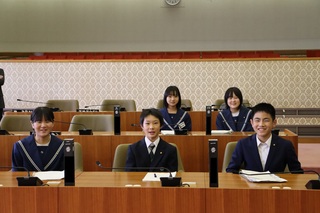 議会改革特別委員会では、主権者教育の取り組みの一環として、昨年度から中学生の職場体験の受け入れを行っております。今年度の2校目として、10月23日、24日に竜王北中学校2年生5名の受け入れを行いました。最初に議長から臨時市議会議員の任命を受け、その後、座学で議会や議員について学んだり、担当課から質問内容について伺い、市議会議員と一緒に質問を作成しました。実際に議場の演壇に立って一般質問にも挑戦しました。